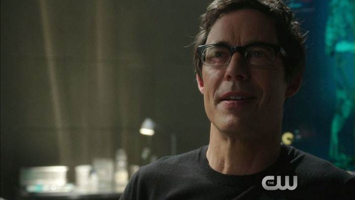 The clip features Arrow guest stars Ray Palmer (Brandon Routh) and Felicity Smoak (Emily Bett Rickards) as they come to STAR Labs for help with Ray’s Atom suit.