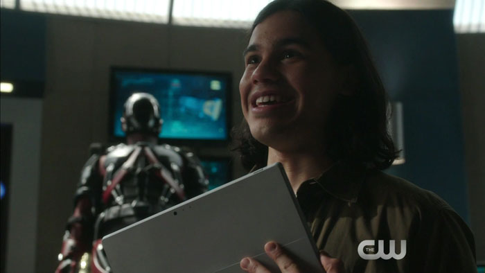 The clip features Arrow guest stars Ray Palmer (Brandon Routh) and Felicity Smoak (Emily Bett Rickards) as they come to STAR Labs for help with Ray’s Atom suit.
