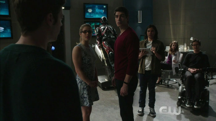 The clip features Arrow guest stars Ray Palmer (Brandon Routh) and Felicity Smoak (Emily Bett Rickards) as they come to STAR Labs for help with Ray’s Atom suit.